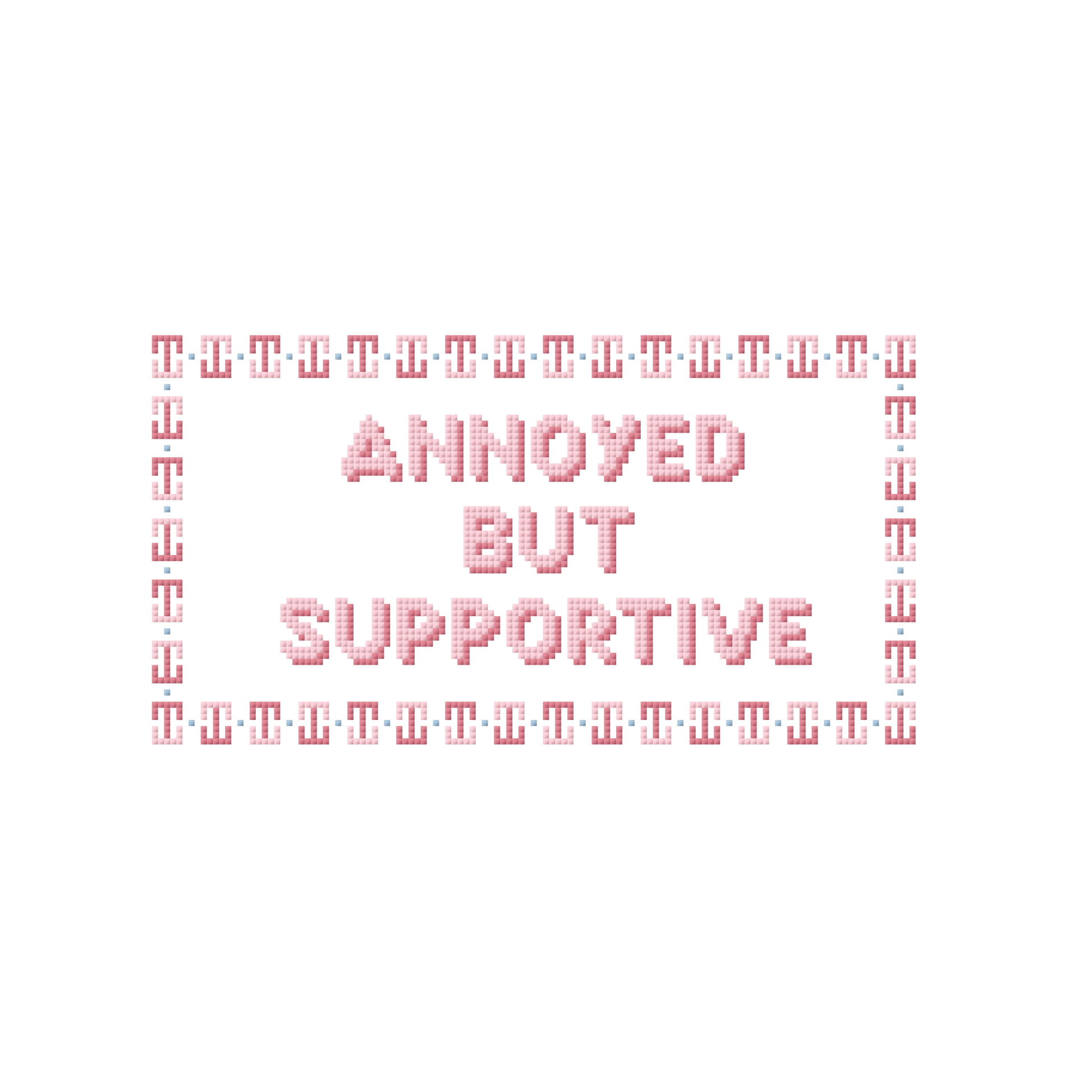 A little honesty, stitched in pink. The Annoyed But Supportive canvas is for best friends, sisters, moms, and anyone who shows up with love, loyalty, and just a little bit of side-eye. Equal parts funny and sweet, this piece makes the perfect gift, ornament, or small pillow for the person who always has your back — even when you’re being a little ridiculous.